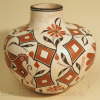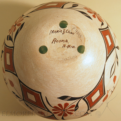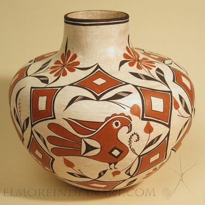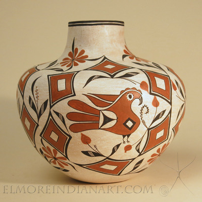 This jar features the traditional Acoma design of the parrot. The parrot is accentuated by a floral design, with four flowers framing the jar’s elegant neck. The design is extremely well-executed and fits the form of the jar nicely. The jar is thinly-molded and completely traditionally made, including pit-firing. The jar is above average in size, measuring 10 ½” height and 10 ¾” diameter, and is in excellent, original condition. This jar is exemplary of Marie Chino’s skill as a potter, and would be an excellent companion to another superb Marie Chino jar, P4355: elmoreindianart.com/Detailed/4681.html