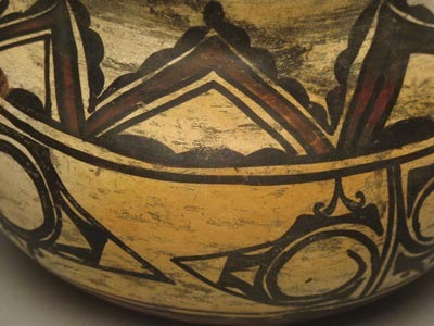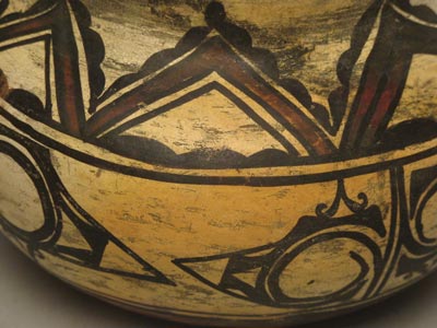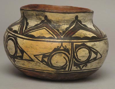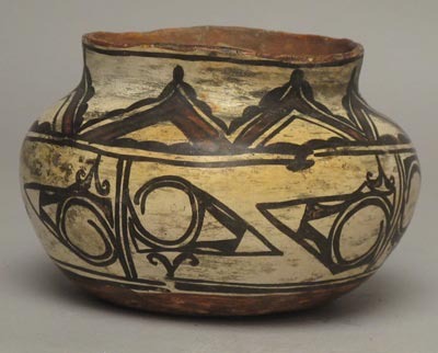 This traditional Polacca jar, dating to the late 19th century, is in excellent condition with no repairs, chips, or cracks. Expertly fired, it features classic Walpi rainbird designs and the early Polacca slip, similar to Zuni pottery, predating Nampeyo’s Sikyatki Revival of 1895. The jar has a beautifully concave bottom and is traditionally made and fired. Unsigned. Measures 7 1/2″ in diameter. A fine example of historic Hopi pottery.
