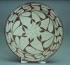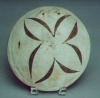 An excellent example of historic pottery from Cochiti Pueblo, this shallow bowl is decorated with elegant floral motifs on both sides and includes two lugs intended to hang the piece vertically. This piece uses the iconic cream colored slip best associated with historic Cochiti pottery. It measures 9″ in diameter by 1 3/4″ deep and is in excellent original condition. Traditionally made and fired, it is an iconic piece of Native American artwork at an excellent price. Highly recommended.