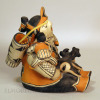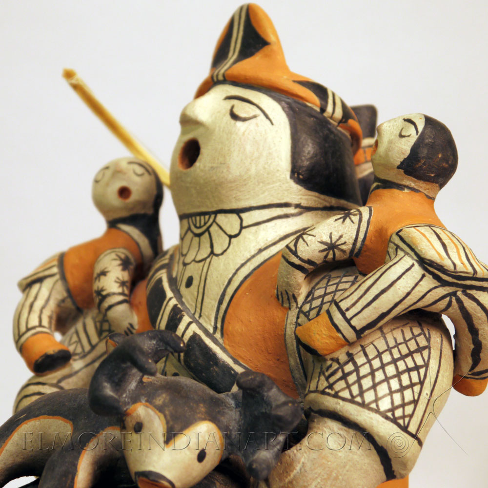 This traditional Cochiti storyteller is seated with an open mouth, in the process of telling his story, while two children perch on his shoulders. The hunter has a bow with which he has just slain the deer on his lap. Bright coloration and excellent detail are shown in the quality of the artistry. The hunter’s clothes are traditional Pueblo with Spanish influence. This traditional figurative clay sculpture represents the oral tradition of storytelling and the transmission of culture, history, and values through generations.