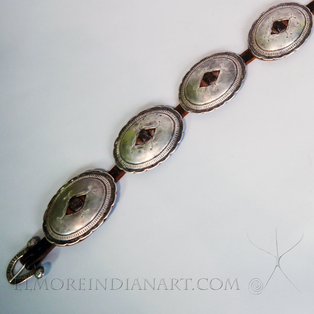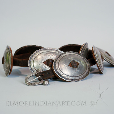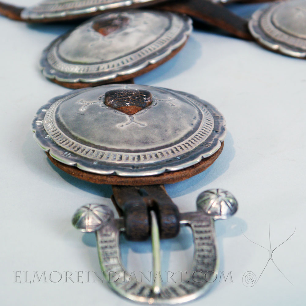 An excellent example of Navajo silver work, this Concho Belt comes from the Ray Dewey collection and dates to the early silverwork period. This classic piece is in great condition and has some amazing stamp work on both the silver and old leather. The small buckle is uniquely sandcast and typical of older belts.