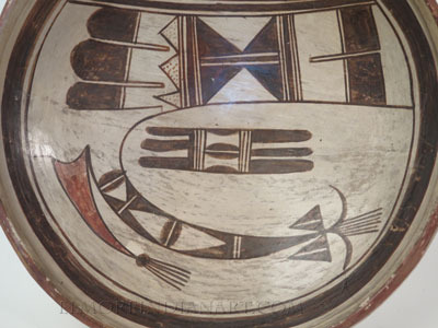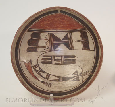 This old Hopi open bowl by Nampeyo dates from her transitional period around 1895. The bowl measures 9 1/4″ in diameter.
