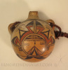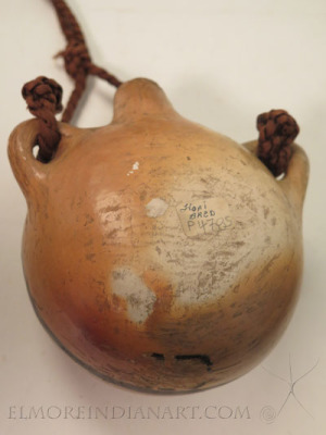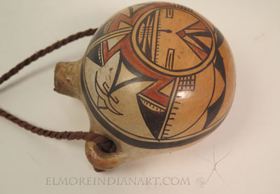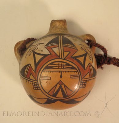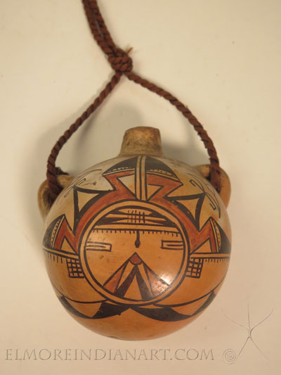 This old Hopi canteen by Nampeyo dates around 1900 and shows the remains of an old Fred Harvey Label: “From the Hopi Villages” which was commonly used on Nampeyo’s ceramics. The polychrome design features Nampeyo’s classic drawing of the Butterfly Maiden, “Pahlikmana.” The canteen measures 5″ x 5″.
