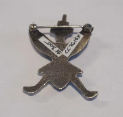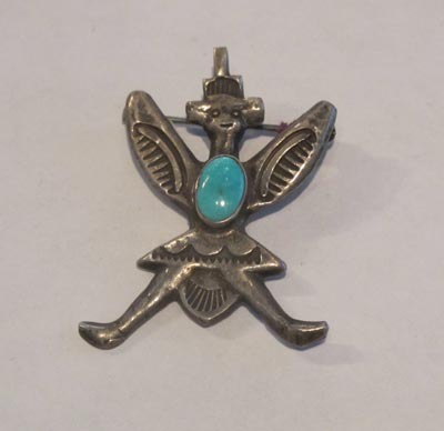 Here is an early knifewing design by Zuni silversmith Horace Iule. Dates from the 1930s. Features intricate traditional casting and stamp work with a nice turquoise stone set in the center. Measures 1 3/4″ high by 1 1/4″ wide. Great piece, great character, by a well known artist.
