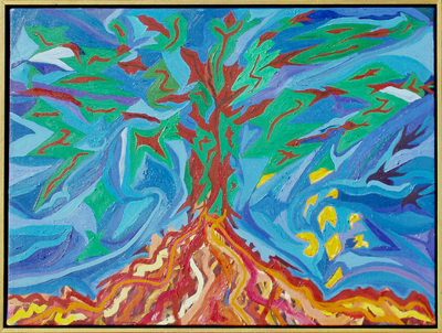 Original oil on canvas by Steve Elmore titled Exploding Tree, framed and signed on the back.