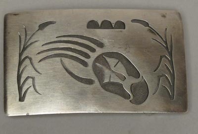 This is a fine older Hopi silver overlay buckle, measure 3 1/4″ long by 2″ high.It is stamped sterling on the back with a hallmark of a cloud or crescent moon. Design is a bear paw from the bear clan with cat-tails on either side and clouds in the sky. Large attractive piece.