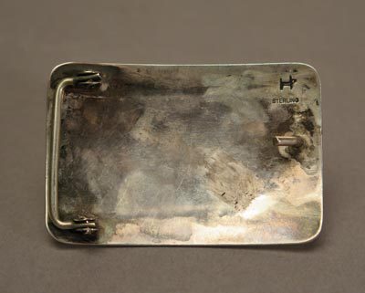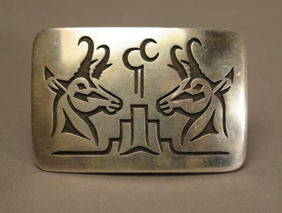 Here is a nice silver belt buckle with overlay design depicting two antelope and a mesa top. Measures 3” by 2”. Signed with the hallmark of silversmith Verden Mansfeild of Shongopavi, Second Mesa.