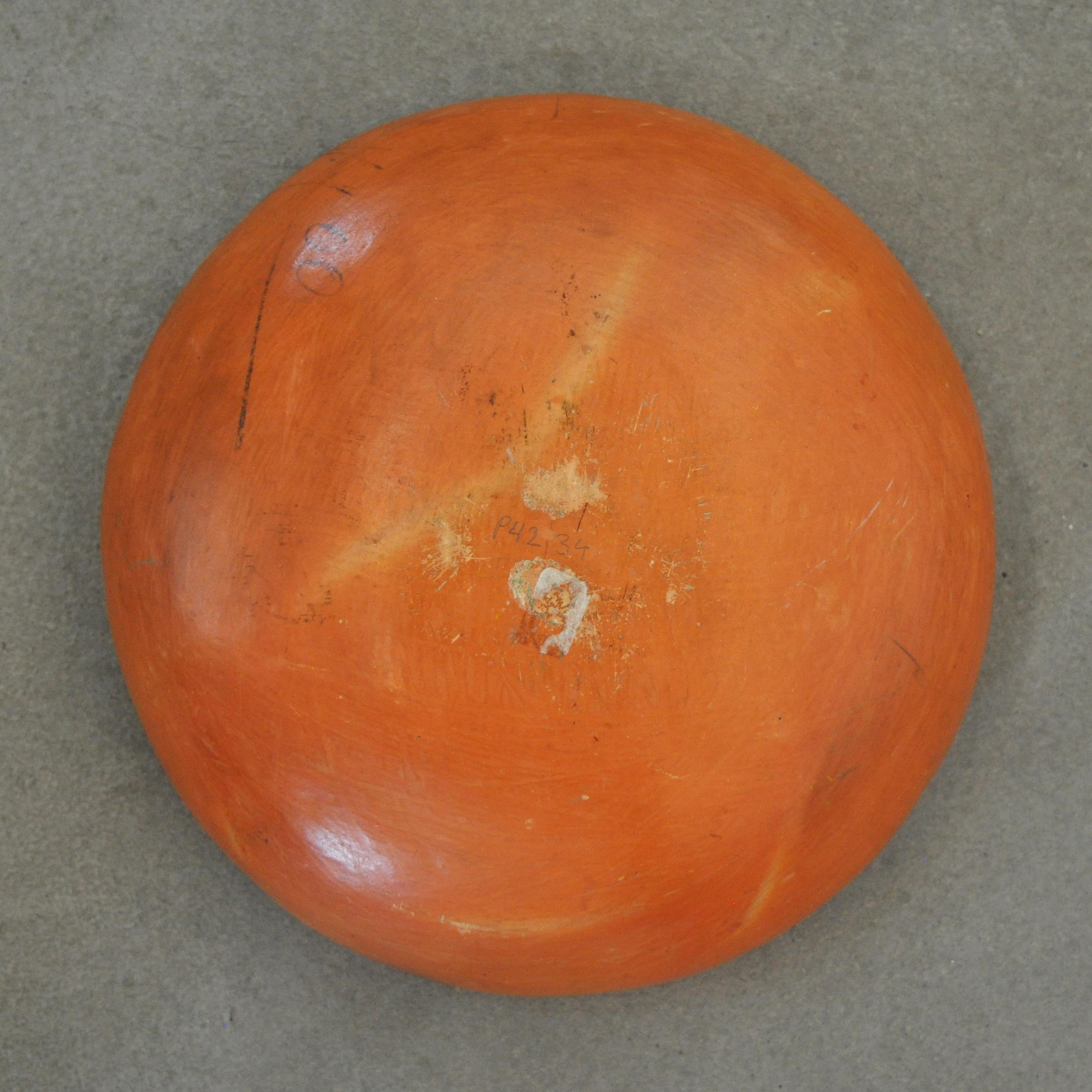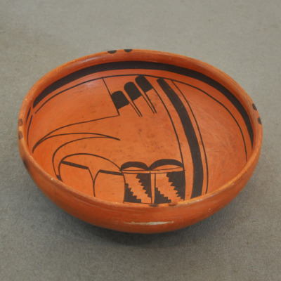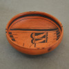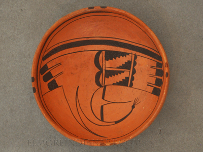 This red-slipped bowl was made by Nampeyo around 1905-1910. The bowl features a classic Sikyatki Revival swirl design, which was almost formulaic by this time, and has Nampeyo’s signature rain drops on the rim. This bowl is particularly well-molded and well-fired, and is a very sturdy ceramic with no repair or restoration. The line work is a very fine example of Nampeyo’s exquisite art in action. The bowl measures 3″ height and 8 5/8″ diameter.