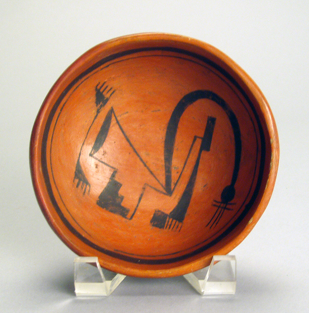 This small abstract bowl features classic Sikyatki Kiva step designs with an arching abstract bird neck leading to its head and beak. The piece leaves plenty of negative space and room for interpretation. The interior design is framed by two black bands. Overall, the designs show Nampeyo’s originality and mastery of abstraction.