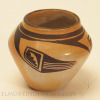 This classic Hopi jar dates to the 1920s. Although the jar is unsigned, the painting and molding both indicate the jar is the work of the Nampeyo family. The abstract design includes the familiar Hopi motif of kiva steps, and suggests birds flying around the mouth of the jar. The jar measures 5″ height and 4 1/2″ diameter, and is in excellent condition with no repair.