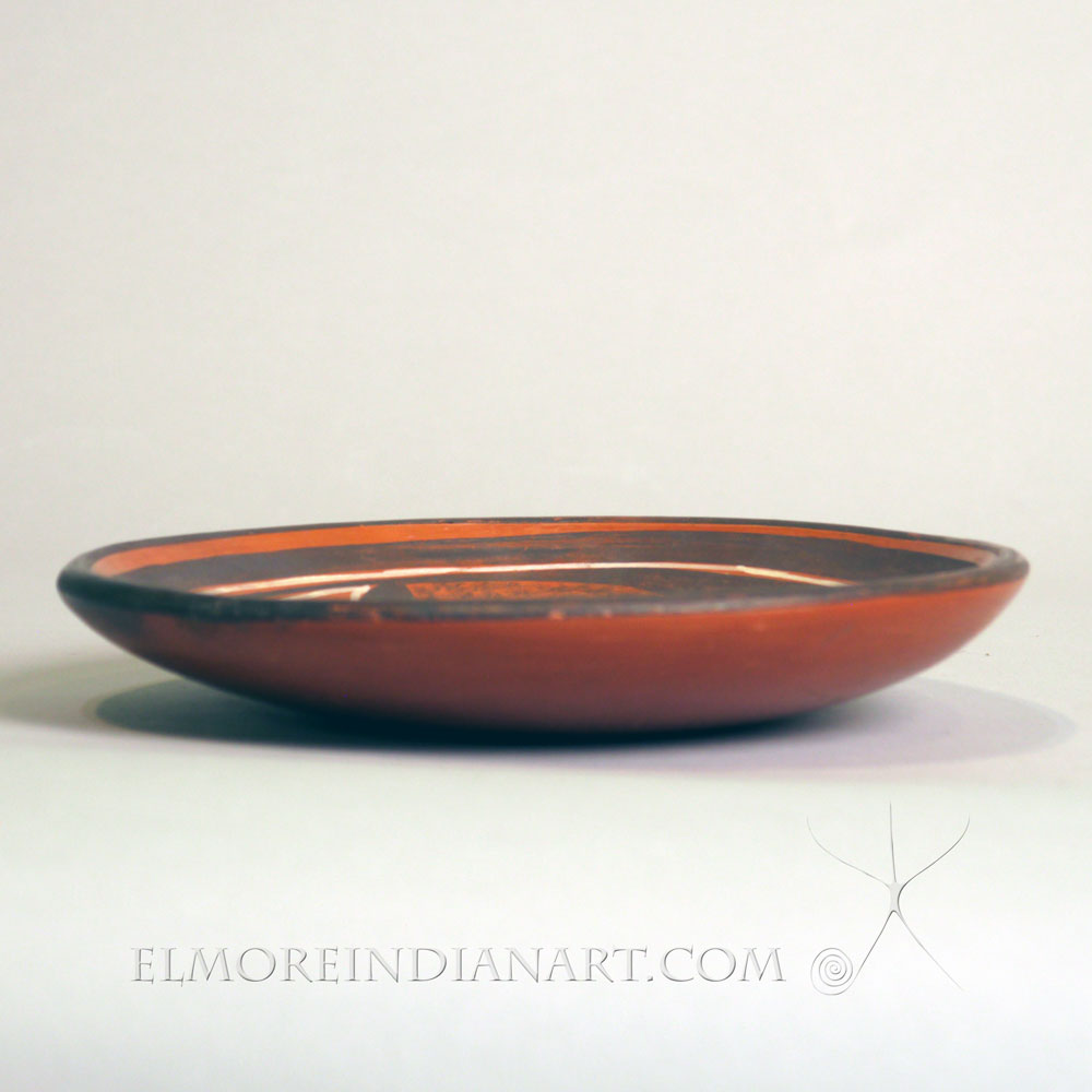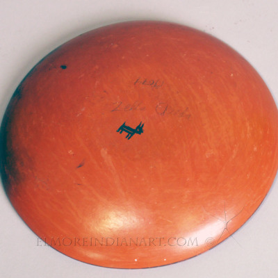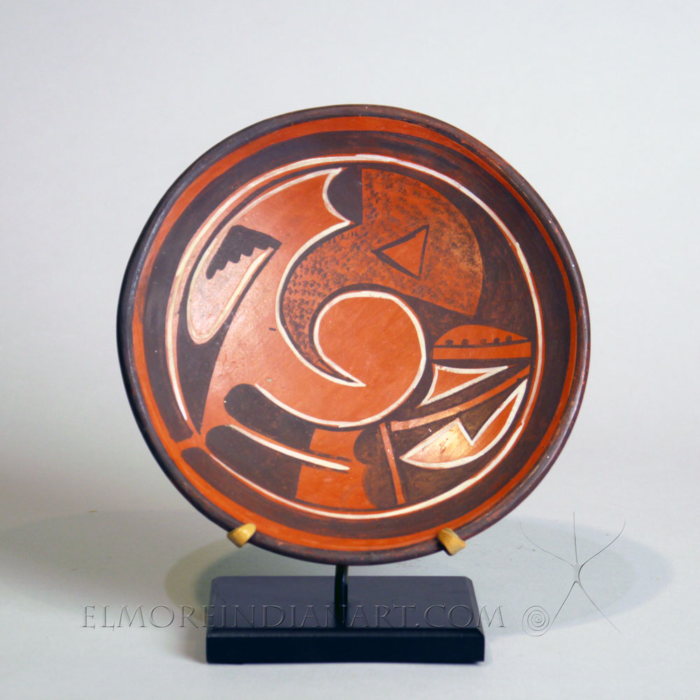 This Hopi black and white on red plate by Zella Cheeda is painted with a continuous spiral composition constructed from opposing avian and geometric elements arranged around a central point. The design integrates solid red fields, stippled texture panels, and sharply defined black contour lines, a format drawn from late Sikyatki bowl layouts.