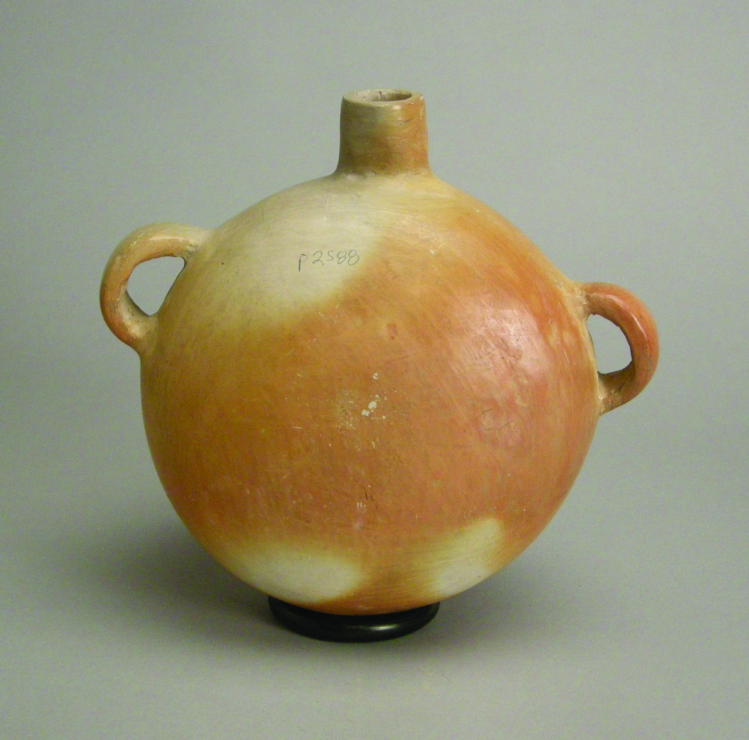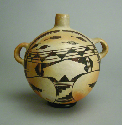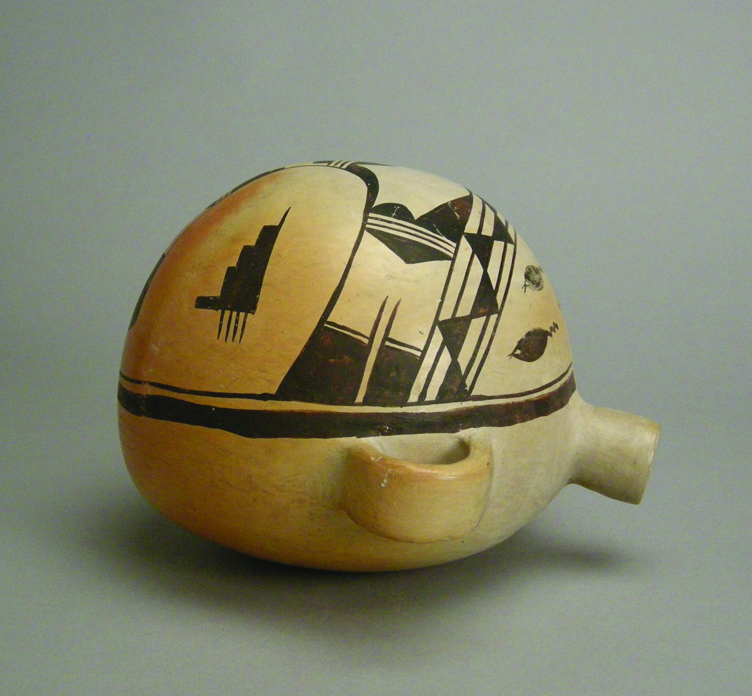 An exceptional example of a Hopi canteen by Nampeyo (1858-1942), the matriarch of modern Pueblo pottery. This piece takes the spherical form of a traditional Pueblo canteen. The designs are elegant original compositions in Nampeyo’s Sikyatki Revival style, combining elements taken from the Pre-Colonial tradition of pottery making at Hopi. The design elements include tadpole motifs common in Hopi religious imagery. This piece measures 8 1/2″ long by 9 1/4″ wide by 7 1/4″ thick. It is in excellent original condition. Includes a museum quality stand custom made for the piece. A definitive example by a master artist.