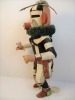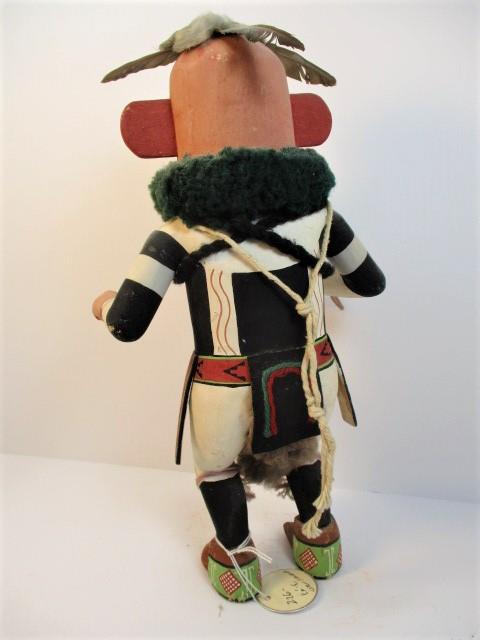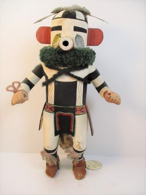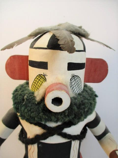 This Hopi doll is a great example of traditional Kachina carving, depicting the Corn Boy or Corn Kachina. This piece has great detail in the miniature ceremonial regalia, including corn insignia on the face, a ruff around the neck made of green yarn and bright green moccasins. This doll measures 1h” high. It is in excellent condition with great age. From a distinguished Arizona collection. An excellent addition to any collection of Kachina dolls.