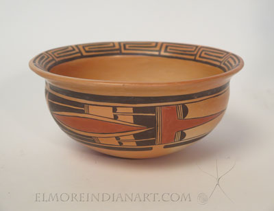 A nice traditional Hopi bowl by contemporary master potter Nyla Sahmie. This piece is a study of similar 19th century helmet stew bowls by the artist’s ancestor Nampeyo (1858-1942). See images in Steve Elmore’s award-winning book In Search of Nampeyo. This piece measures 4″ high by 9 1/8″ in diameter and was handmade and pit fired traditionally. Excellent line work by a master potter.