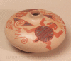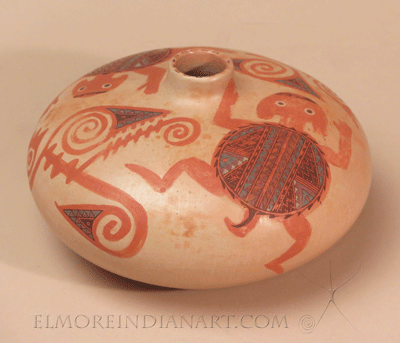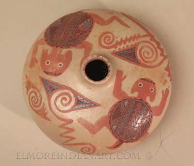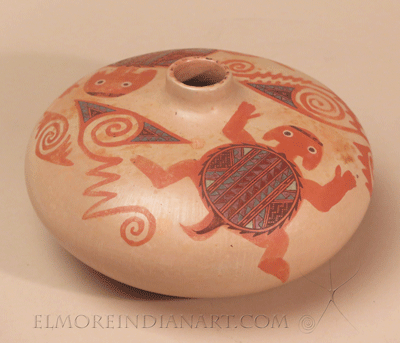 This seed jar by Hopi-Navajo potter Nathan Begaye has a traditional form and a prehistoric-inspired design. The jar measures 4 3/4″ height and 7 3/4″ diameter, and is in excellent original condition. It is signed “Nathan B Navajo Hopi 11-8-93,” and comes from the collection of Nathan’s longtime patron in Santa Fe, who allowed him to trade pottery for housing for many years. This ceramic well shows Nathan Begaye’s exceptional talent. Read more about Nathan Begaye here: elmoreindianart.com/Detailed/4500.html