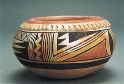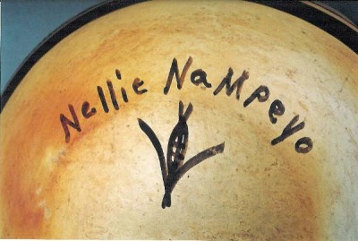 This polychrome bowl with a corrugated rim, is signed by Nellie Nampeyo, daughter of Nampeyo of Hano. It measures 5 3/4″ in diameter by 3 1/4″ high. A solid example of second generation Sikyatki revival.