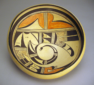 Large, open Hopi polychrome bowl c.1920 in good condition. Attributed to Te-Wang-I-Nema, a student of Nampeyo’s who was an active potter from the 1920s to 1940s. Measures 13″ in diameter. An excellent addition to any collection.