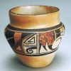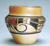A Hopi polychrome pottery vase with Nampeyo designs and form. The bottom reads “Pocatello, Idaho, 1929.” This piece is in excellent condition and is well molded and painted. The vase measures 6″ high by 6 1/4″ in diameter. Nampeyo perfected the vase form under the influence of Art Pottery from Ohio.