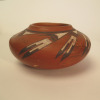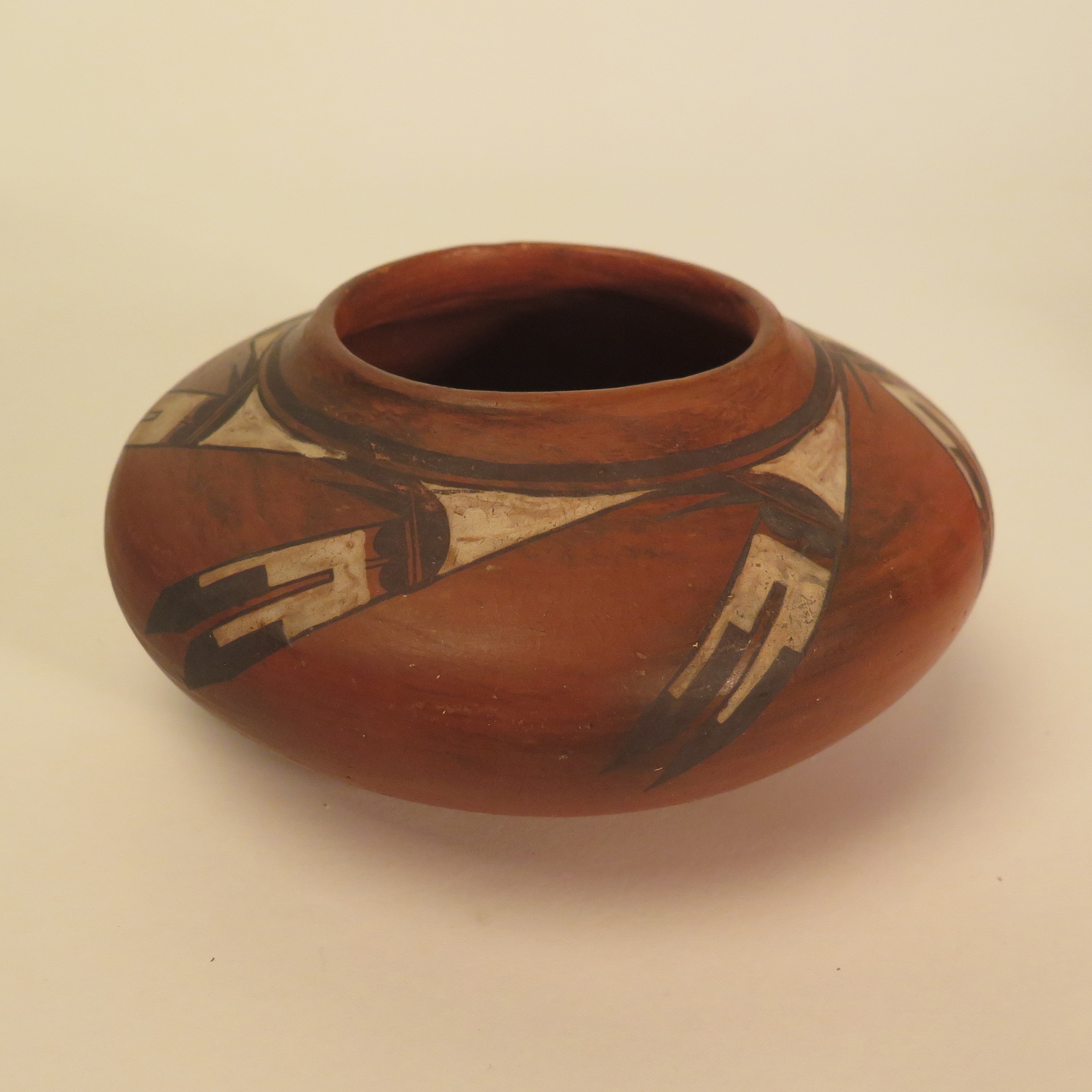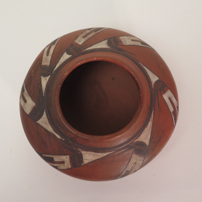 A masterful example of the Sikyatki Revival art movement, this Hopi jar is the mature work of the great Hopi-Tewa ceramicist Nampeyo (1858-1942). The striking abstracted black and white feather motif is a variation on the iconic migration pattern which has become a hallmark of five generations of Nampeyo family potters. The precision of this inspired design and the black, white and red palette clearly date this piece to Nampeyo’s mature period post-1900. In these pivotal years, Nampeyo’s work had a profound impact on the emergence of modernism in America.