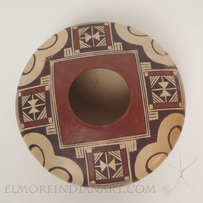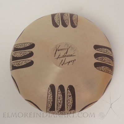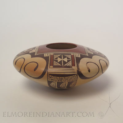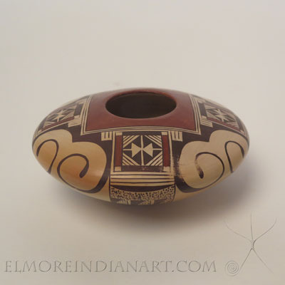 An excellent new traditional Hopi seed jar by Jeremy Adams, this piece has an elegant form and the artist’s typical precision in the painting. The eagle tail design is a hallmark of the Nampeyo family of potters, revived from pre-historic Sikyatki designs by the artist’s ancestor Nampeyo (1858-1942). Jeremy Adams is the son of the master potter Vernida Polacca Nampeyo. This piece measures 7 1/2″ in diameter by 3 1/2″ high. It is traditionally made from native Hopi clay and pit fired out of doors at the artist’s home in Polacca, Arizona. Clearly signed by the artist. An excellent addition to your collection of traditional Hopi pottery.