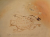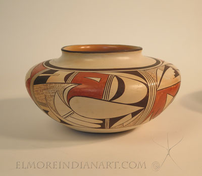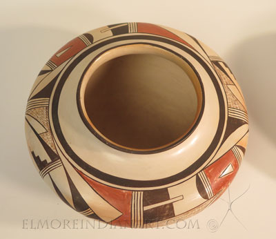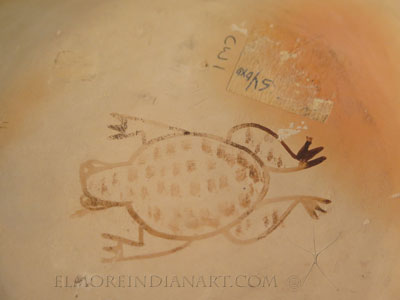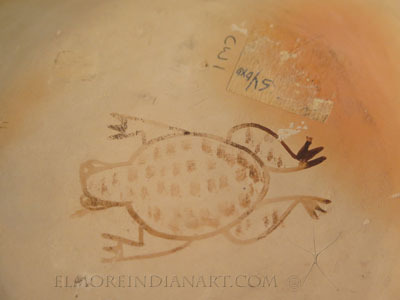 This impressive jar is signed with the distinct frog indicating it is the work of Paqua Naha, also known as the first Frog Woman. Paqua studied pottery-making directly under Nampeyo in the 1910s, when she mastered the yellowware style. This is a classic example of the creamy white slip that she and her descendants are best known for. Both the jar’s elegant, high-shouldered form and classic Sikyatki Revival designs are exemplary of Paqua’s work. This jar is finely made, with slipping inside the vessel’s mouth. It measures 6″ high by 12″ in diameter. It is traditionally made from native Hopi clay and pit fired traditionally. Excellent original condition. A great addition to any collection of Hopi masters.