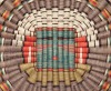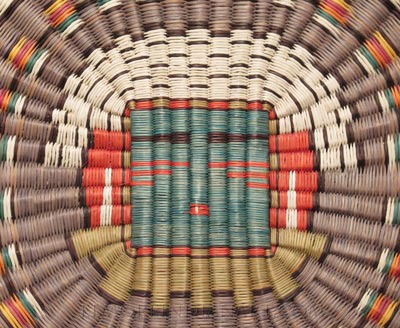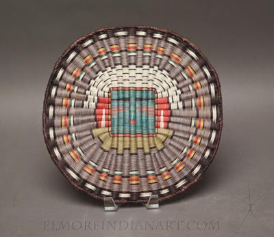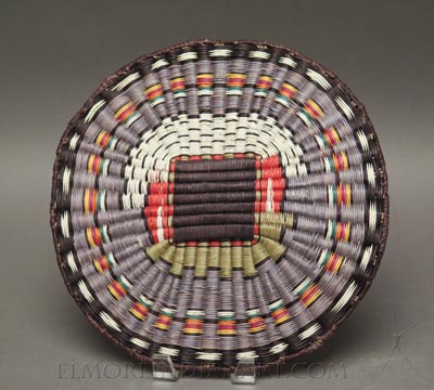 This wicker plaque is an excellent example of a Hopi pictorial basket from Third Mesa in the 1950s, this one depicting the face of Silent Warrior katsina. The design shows great color and detail. The plaque measures 12″ in diameter and is in excellent original condition. A great addition to any collection of Hopi wickers!