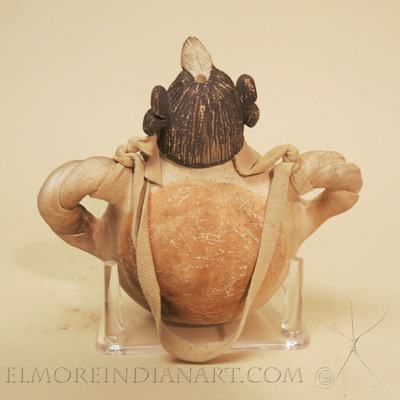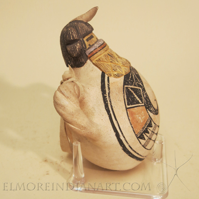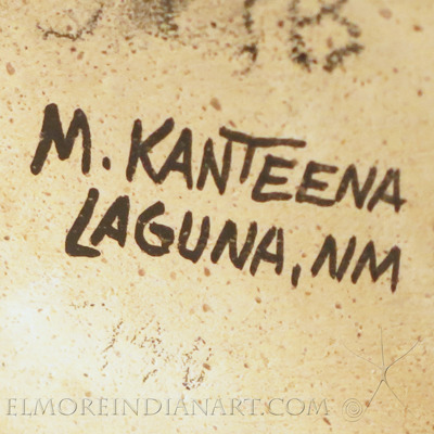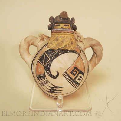 This polychrome canteen is exemplary of the figural pottery of Laguna master potter Michael Kanteena (1959- ). The canteen is signed “M. Kanteena Laguna, NM.” A Hopi katsin mana kachina sits atop the canteen. She has traditional Hopi maiden “butterfly” hair whorls with a feather on top of her head. The face of the canteen is decorated with a Sikyatki Revival design in keeping with Kanteena’s homage to Hopi pottery. The canteen measures 5 1/2″ height and 6″ width, and is in original condition.