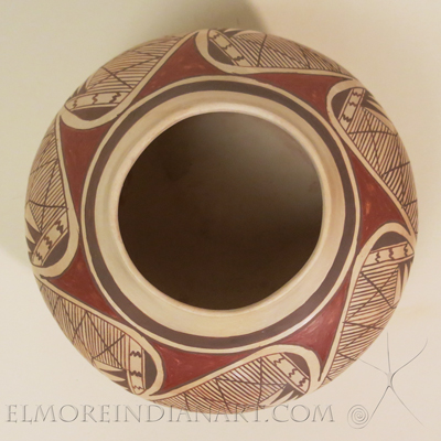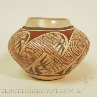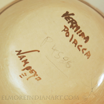 Hopi master potter Vernida Polacca Nampeyo (1955- ) made this white-slipped migration jar in April 2022. Vernida is the great-granddaughter of Nampeyo and the granddaughter of Fannie, Nampeyo’s most prolific and skilled potting daughter. Fannie taught Vernida pottery-making. For decades, Vernida made traditional Hopi pottery the way Fannie taught her, and she is well-known for precisely executing family designs, particularly the migration. This fine migration example of her work decorates a well-molded jar. Vernida utilized her new whiter slip on this jar, and it fired well. The jar measures 6″ height and 8″ diameter, and is in excellent, original condition. Complimentary shipping is included.