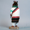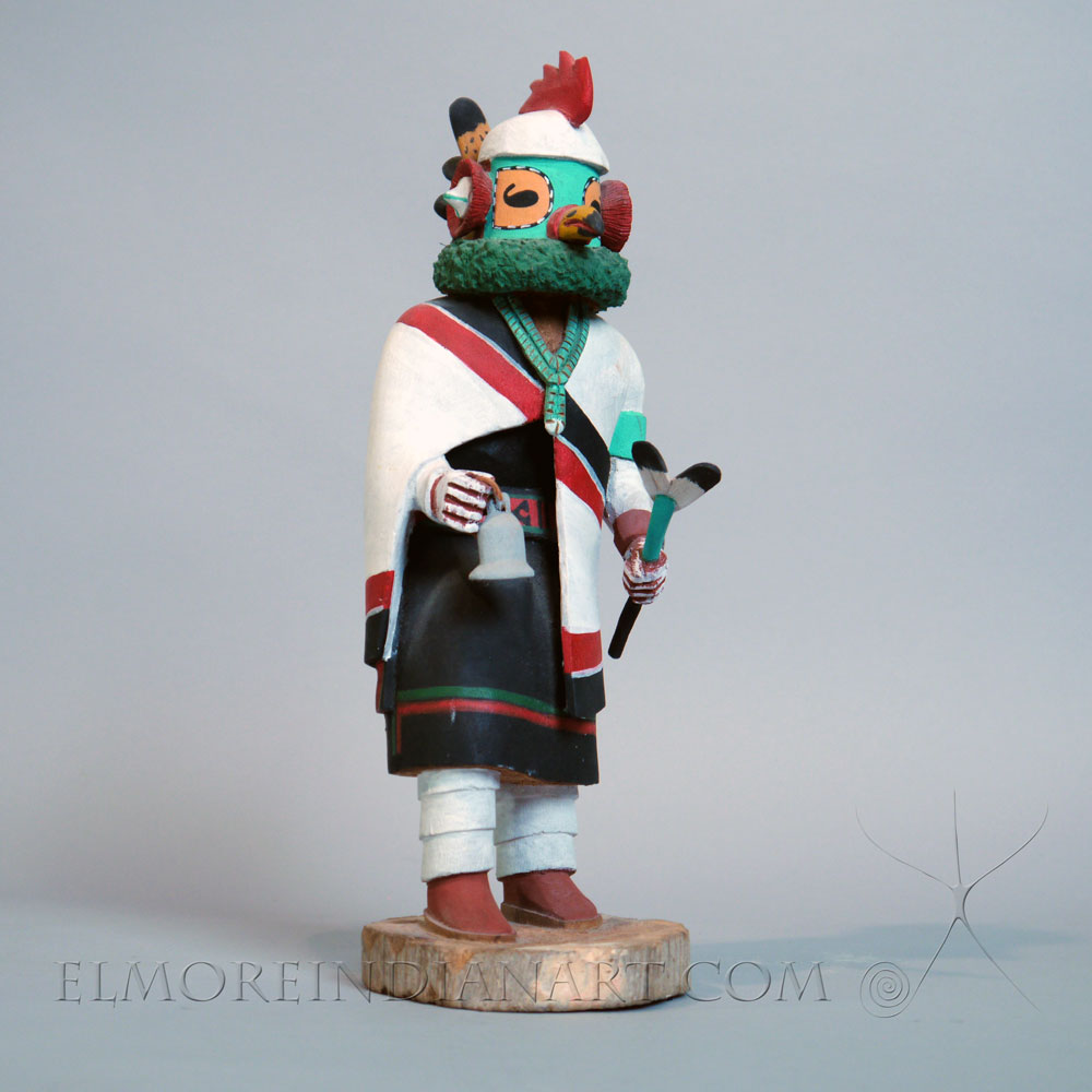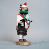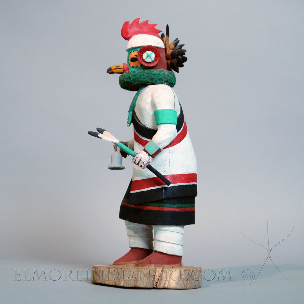 The Kowako Kachina represents a rooster or a chicken. This doll depicts the female version of the chicken kachina with a woman’s maiden shawl and white boots. This piece is carved from cottonwood root and features a distinctive blue face and a red beak. The miniature regalia shows excellent attention to detail, including a Douglass Fir ruff around the neck.