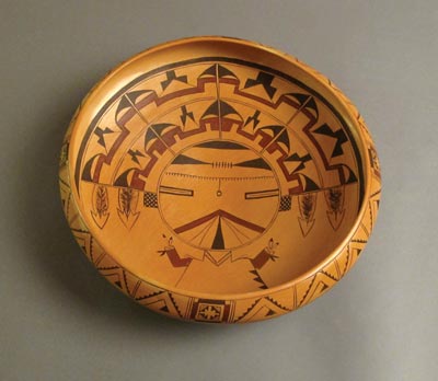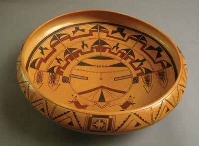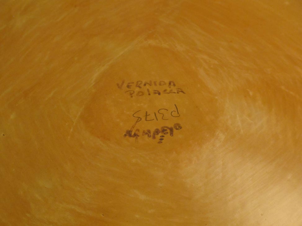 An impressive piece by Hopi-Tewa master potter Vernida Polacca Nampeyo, this large bowl features the Pahlik Mana kachina design, one of many designs the artist inherited from her ancestor Nampeyo (1858-1952). This piece measures 15″ in diameter by 4 1/2″ high and is fired traditionally. It is clearly signed by the artist. Vernida learned the art of traditional pottery directly from her grandmother Fannie Nampeyo. This piece is made in the Sikyatki Revival style introduced by Nampeyo and carries on a centuries-old tradition of pottery at Hopi. A fantastic piece of pottery by a Hopi master artist.