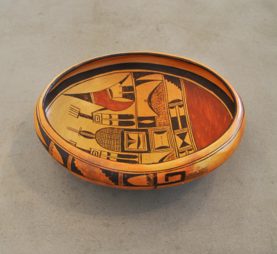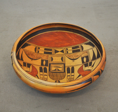 This piece measures 4 ¾” in height by 14 ½” in diameter, museum quality, and is in excellent condition. There are two similar bowls, one in Woolaroc, signed by Fannie, and one unsigned in the Museum of Northern Arizona.
