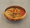 This example from Nampeyo’s mature period dates to 1930, and was molded by Nampeyo and painted by her daughter Fannie. The design is a classic example of Nampeyo’s Sikyatki Revival. The collaborative piece between Nampeyo and Fannie features a large, abstract polychrome bird on the interior, using classic Sikyatki designs as well as the mother-daughter pair’s innovations. The bird’s head and beak are centered between its feet with its wings arching down on either side. There are details of feathers and geometric patterns throughout, and the whole design is framed with a black band encircling the interior of the bowl and a small band on the rim of the piece. The exterior of the bowl bares a large avian band encompassing the piece.