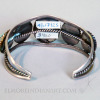 This elegant Navajo turquoise bracelet, c. 1940–1950, features five well-matched oval turquoise cabochons with rich blue color and pronounced natural matrix. Each stone is individually framed in twisted wire and set across a classic split-shank sterling silver cuff, accented with subtle hand-stamped motifs along the bands. The balanced repetition of stones, restrained silverwork, and clean construction reflect a mature phase of Navajo jewelry making, when traditional techniques were refined into confident, wearable forms. With its harmonious design and high-quality turquoise, this bracelet is a timeless example of mid-century Navajo silversmithing.
