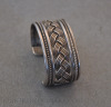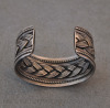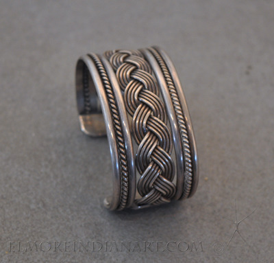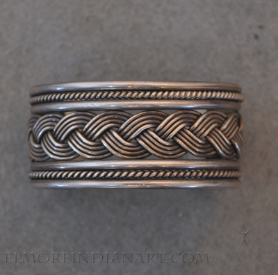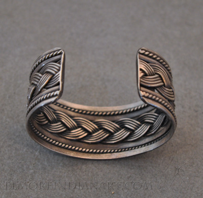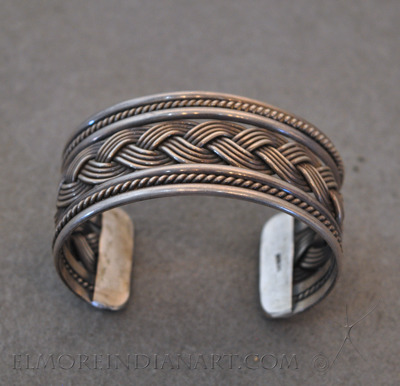 This is a Navajo silver bracelet from the 1950s. It has twisted silver wire and a central braided silver design framed by four shanks. The bracelet measures 5 1/2″ on the inside with a 1 1/4″ opening. It is stamped “sterling” but has no hallmark.