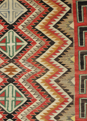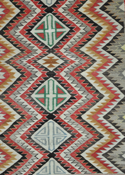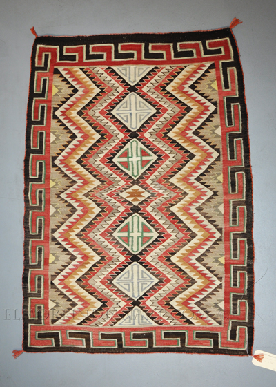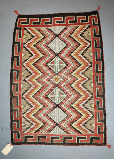 This colorful Navajo rug is a classic example of an historic weaving from Red Mesa Trading Post, near Teec Nos Pos, dating to about 1915 or 1920. The popular eyedazzler design is well-executed, with the signature Red Mesa orange dye, and blue, green, red, beige, and brown completing the palette. The rug has some minor wear and fading, more so on one side than the other (see photos), and measures 50 1/2″ height and 36″ width. This is an excellent example of a famous design commissioned by a famous trading post.