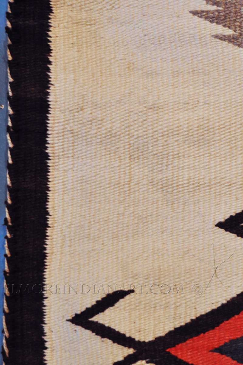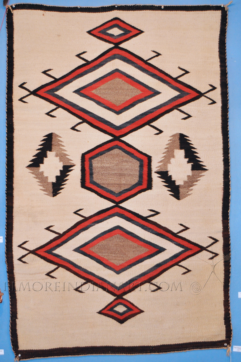 This vintage Navajo rug dates to the 1920s, and shows influence from the Mexican weaving tradition with its Saltillo-style diamonds. The weaving measures 60″ height and 40″ width and is in excellent condition with some minor wear.