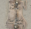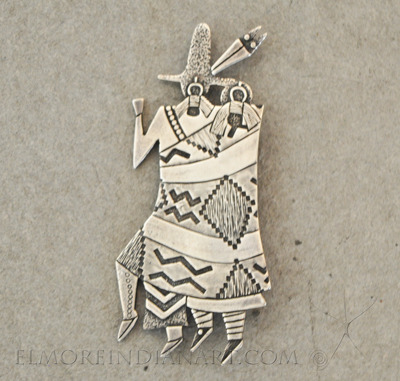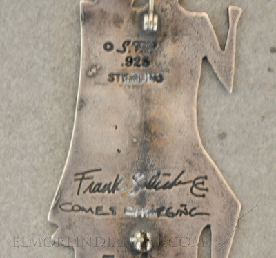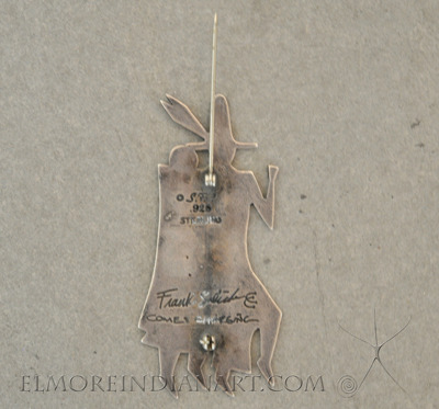 This is a sterling silver pin by Navajo/Diné artist Frank Salcido (1955- ). The back features his full signature and hallmark “Frank Salcido Comes Charging.” Frank Salcido was a graduate of IAIA, and is well-known for his painting and silversmithing. As indicated on the back of the piece, the pin is made from 925 sterling silver. The pin’s design is of a Navajo man and woman in a traditional blanket dance. It measures 2 ½” height and 1 1/8” width. A great authentic piece of Southwest jewelry, perfect for adorning a hat or jacket.