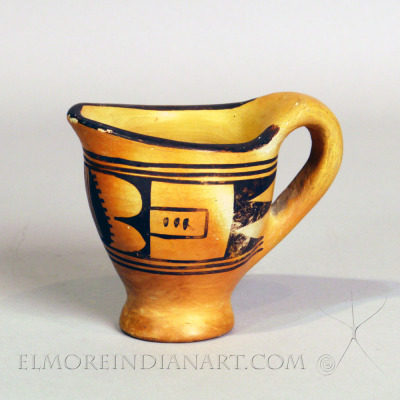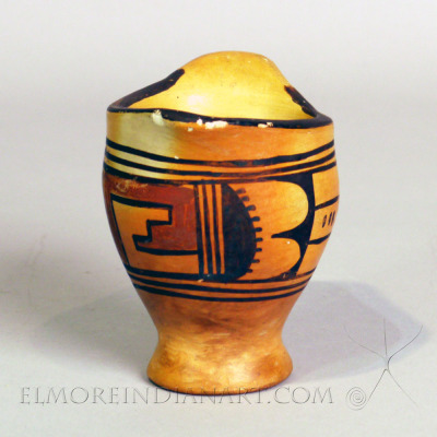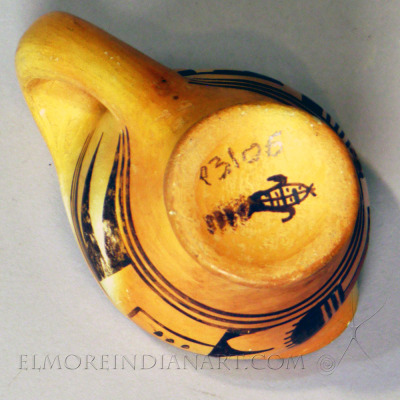 This small vessel has a bright yellow slip and polychrome design of an abstract bird alternating in red and black. This piece features Fannie Nampeyo’s glyph signature of the Corn Clan.