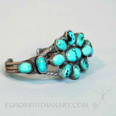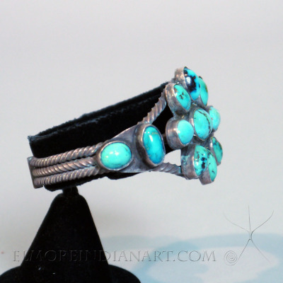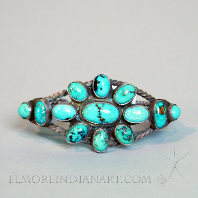 Nice example of Zune silverwork, with three twisted wire shanks blended and beautiful side stones highlighting a fine floral display of turquoise. Unsigned.