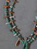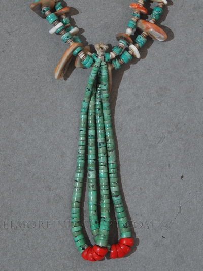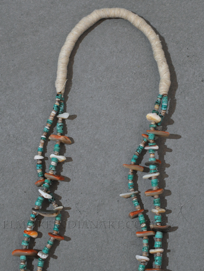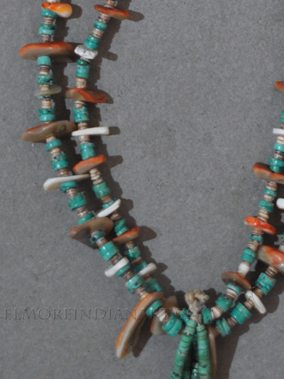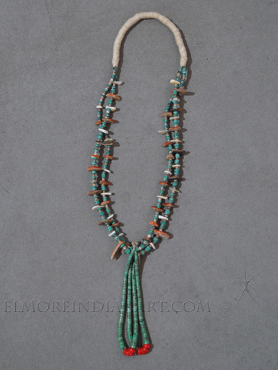 This is a Pueblo two-strand necklace with turquoise and shell heishe, shell tabs, and two jaclas with turquoise and coral beads. The necklace has a “squaw wrap” closure, and measures 36” end-to-end—hanging nicely with the jaclas resting just at the base of the sternum. The beads were hand-drilled with a pump drill, and the necklace dates to about the 1920s. An excellent example of traditional pueblo jewelry. Complimentary shipping included.