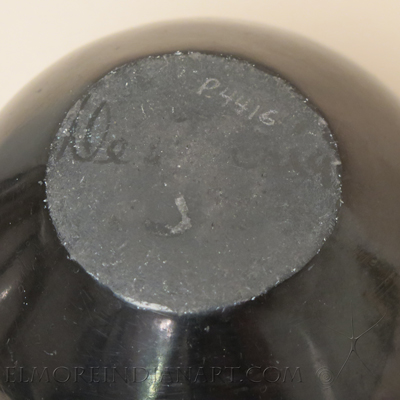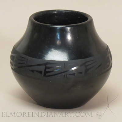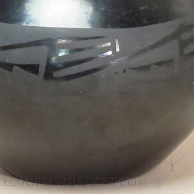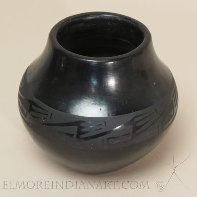 This nice jar by Maria Martinez’s sister, Desideria, features a feather design. Desideria Montoya Sanchez (1889-1982) was one of San Ildefonso’s master potters, and often worked with her husband, Donicio, who painted some of her pottery. The jar is clearly signed in the clay on the bottom “Desideria.” The technique is to polish the entire jar with a shiny finish and then to paint in the negative grey to create the design. This jar has an appealing high polish, with minor scuffing, and measures 4 3/8″ height and 5″ diameter.