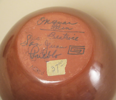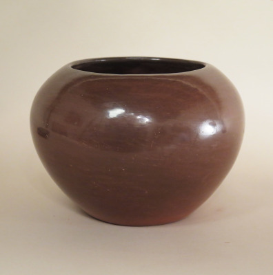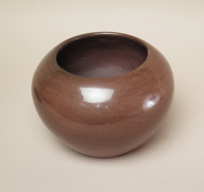 San Juan polished redware bowl. A beautiful polish on this brown to red bowl made by Onquan Peen, also signed Beatrice. A traditional piece of polished plainware.
