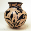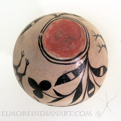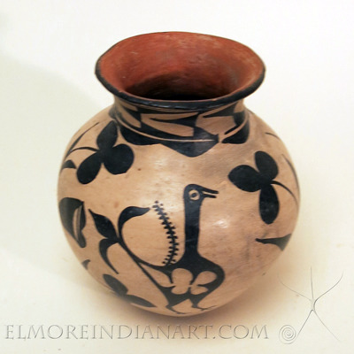 This classic Santo Domingo black on cream jar dates to 1910-1920. The floral design with birds exemplifies Santo Domingo artistry from this ceramic period. The jar is traditionally-made, and pit-fired. The form is also traditional, which has been miniaturized here for easy transport for the tourist trade.