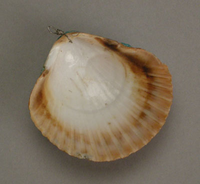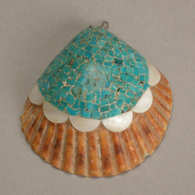 This is traditional Pueblo shell pendant with mosaic inlay turquoise and mother of pearl. This pendant would look great on any strand of heishe or a silver chain. It measures 2 3/4″ wide by 2 1/2″ long. It was made in the 1950’s to 1960’s and is in good condition.