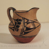 This charming Santo Domingo pitcher dates to the 1930s. Black floral designs decorate the pitcher’s cream slip. The pitcher measures 5″ height and 5 1/4″ width, and is in excellent condition with no repair. This pitcher is an excellent example of the influence of Euro-American culture on Pueblo pottery.