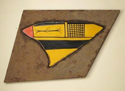 This is the third oversize oil painting of a prehistoric Sikyatki Shard that Steve has done for this summer’s show. It measures 48″ x 37″ and of course, like a shard, is irregular in shape. The background is applied arroyo sand, carefully sifted. It’s an abstraction of an abstraction. Can be shown at different angles, big presence.