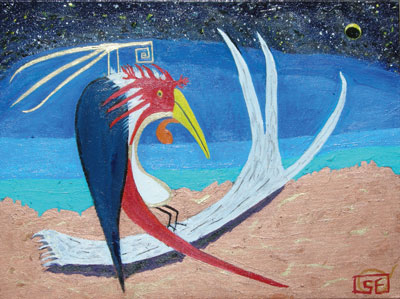 Spirit bird is a constant companion, a colorful jester and enthusiast, who sees the bright shiny things of life and goes toward them instinctively. Like myself, he is both predator and connoisseur. Here, he sits on O’Keefe’s antler.