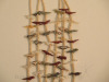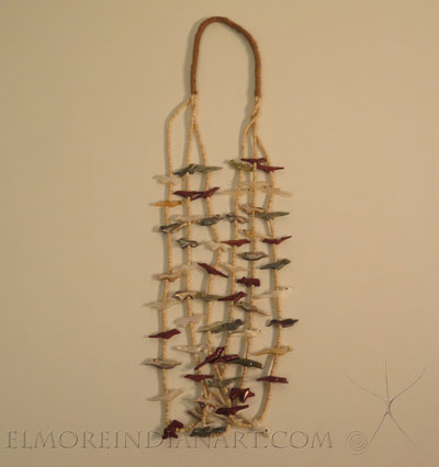 This fetish necklace is an iconic example of fine Zuni carving c.1940, featuring over 60 elegant, hand-carved bird fetishes interspersed between traditional white clamshell heishe beads. It is finished with a traditional Pueblo wrap without a clasp and measures 31″ around. A complex, wearable piece of classic Zuni craftsmanship. Excellent original condition. Carver unknown.