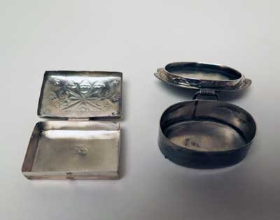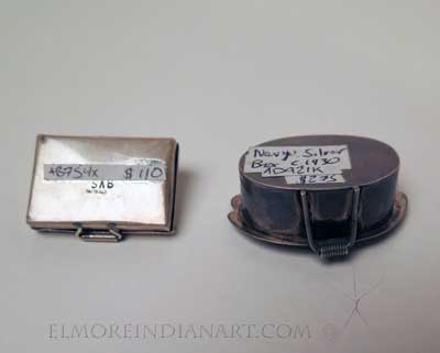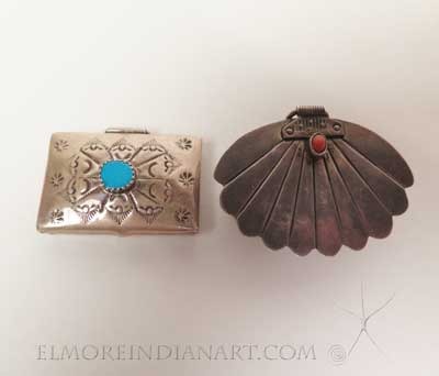 Two nice examples of Navajo silver pillboxes. Both are great examples of silverwork with handmade silver hinges.