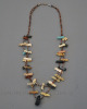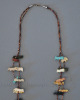 This fetish necklace is a great example of fine Zuni jewelry-making. Featuring small hand-carved fetishes depicting bears and foxes with a larger jet bear as a central pendant, this piece demonstrates a variety of colors and forms. The fetishes are strung on two strands of shell heishe beads measuring 27″ in total length from clasp to clasp. Excellent original condition. Carver unknown.